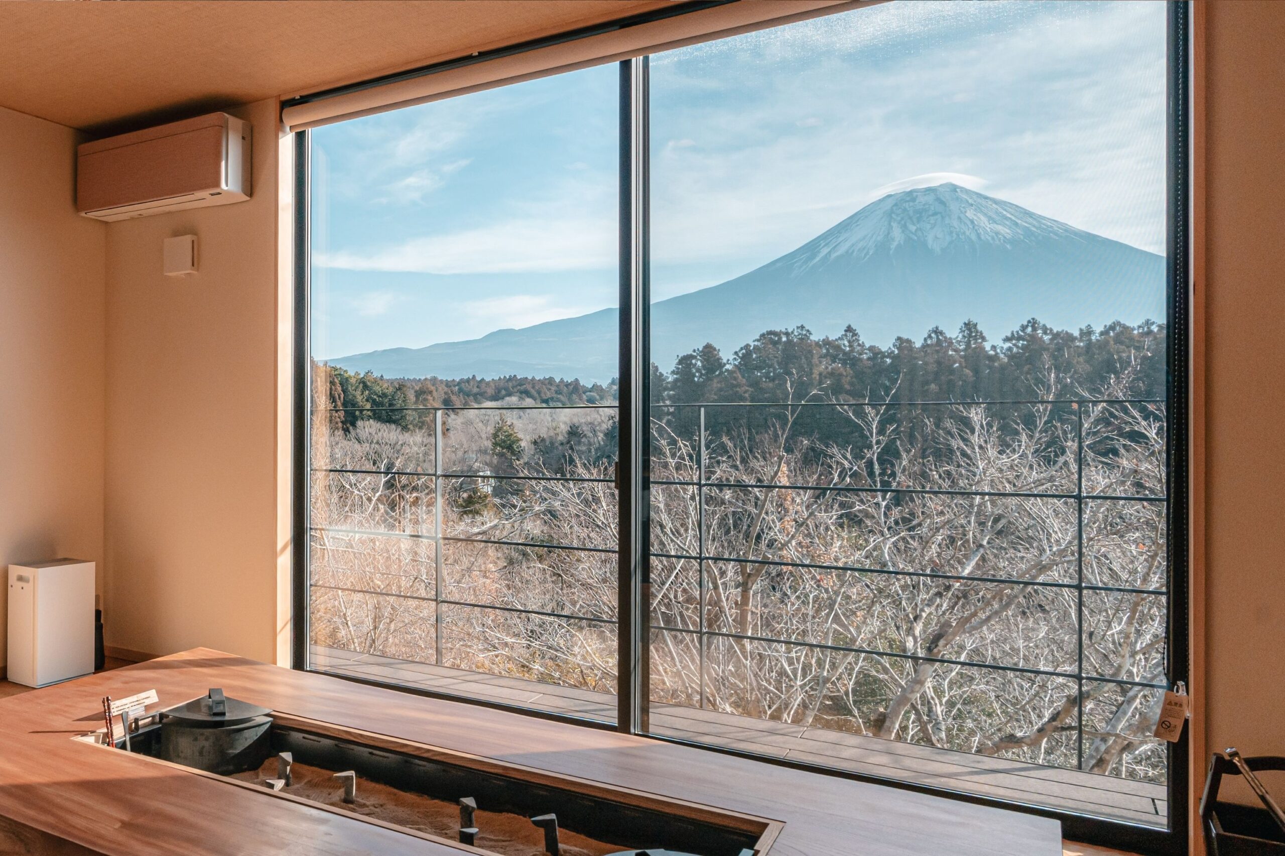 ダイニングには囲炉裏テーブル、2F寝室からは特注の大きな窓ガラスで富士山を一望