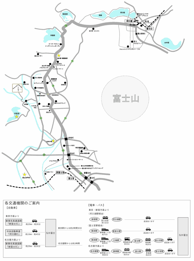 【富士急行線河口湖駅】・【東海道新幹線新富士駅】・【JR身延線富士宮駅】より送迎を行っております。
