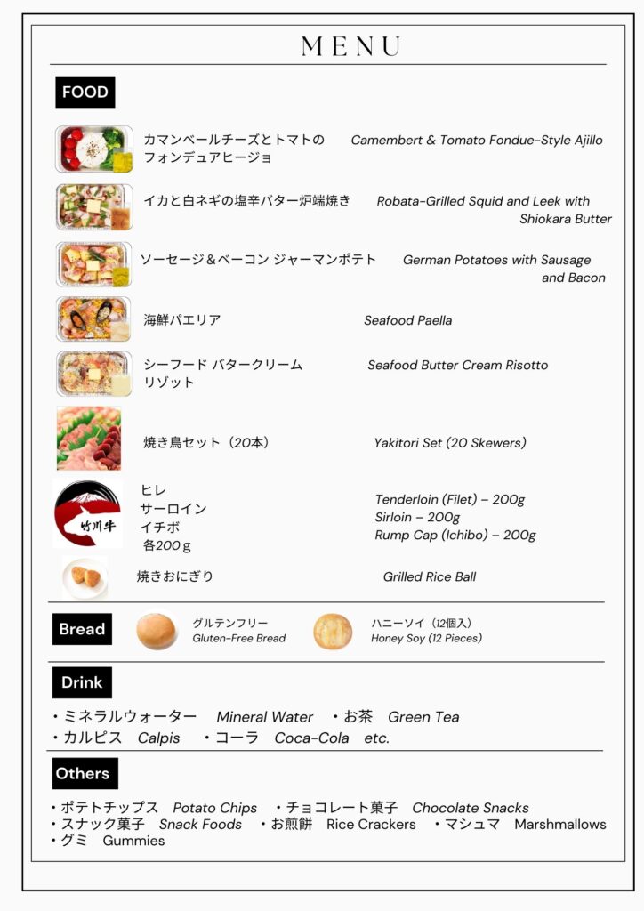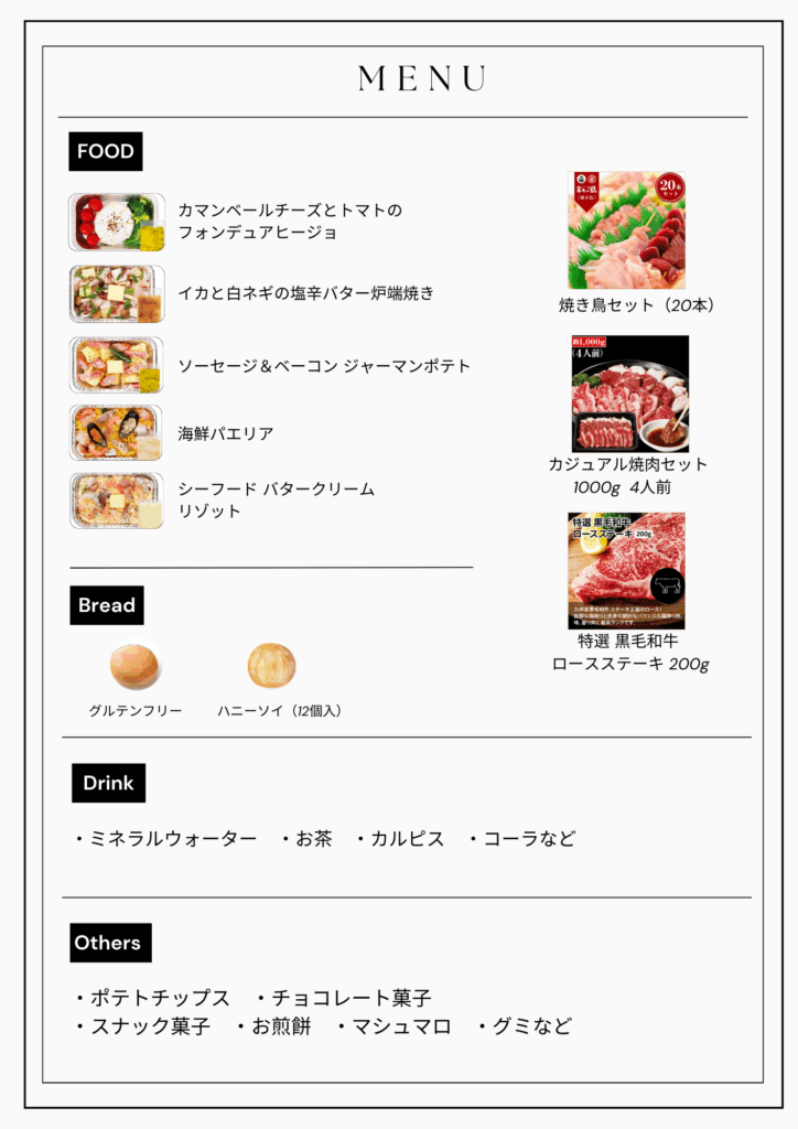 BBQ用の食材やドリンク・スナック・パンの販売を管理棟で行っております。 食材とパンについては冷凍でのお渡しとなります。解凍してお召し上がりください。