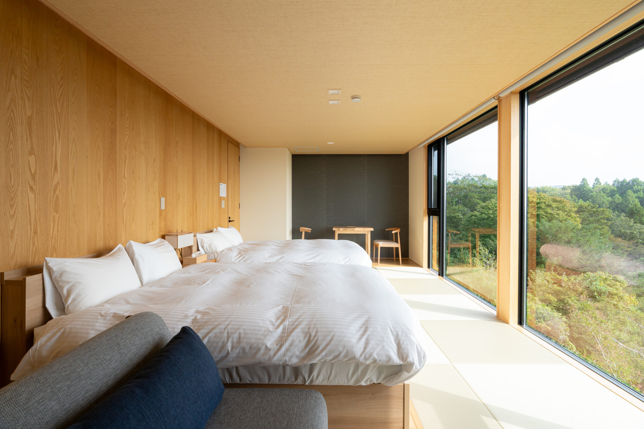 和モダン調の落ち着いた内装と木々に囲まれた高級感あふれる客室