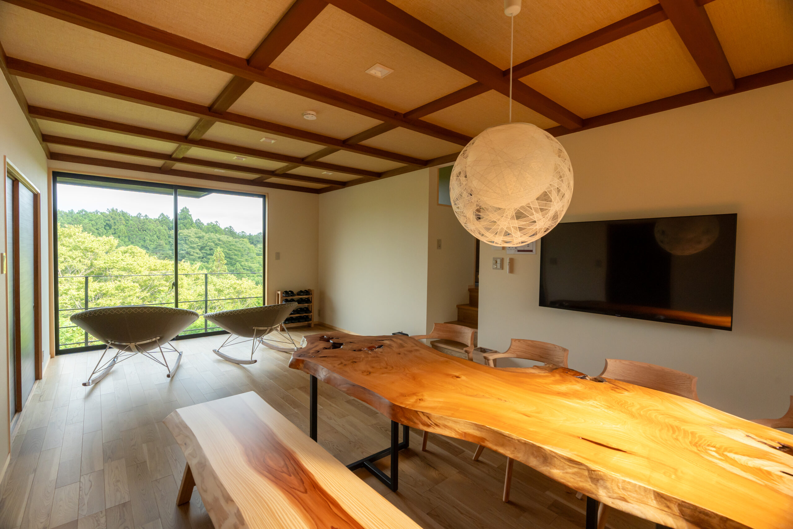 ダイニングには囲炉裏テーブル、2F寝室からは特注の大きな窓ガラスで富士山を一望