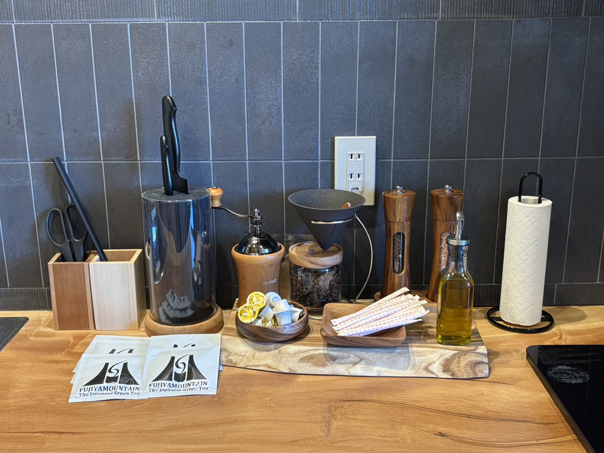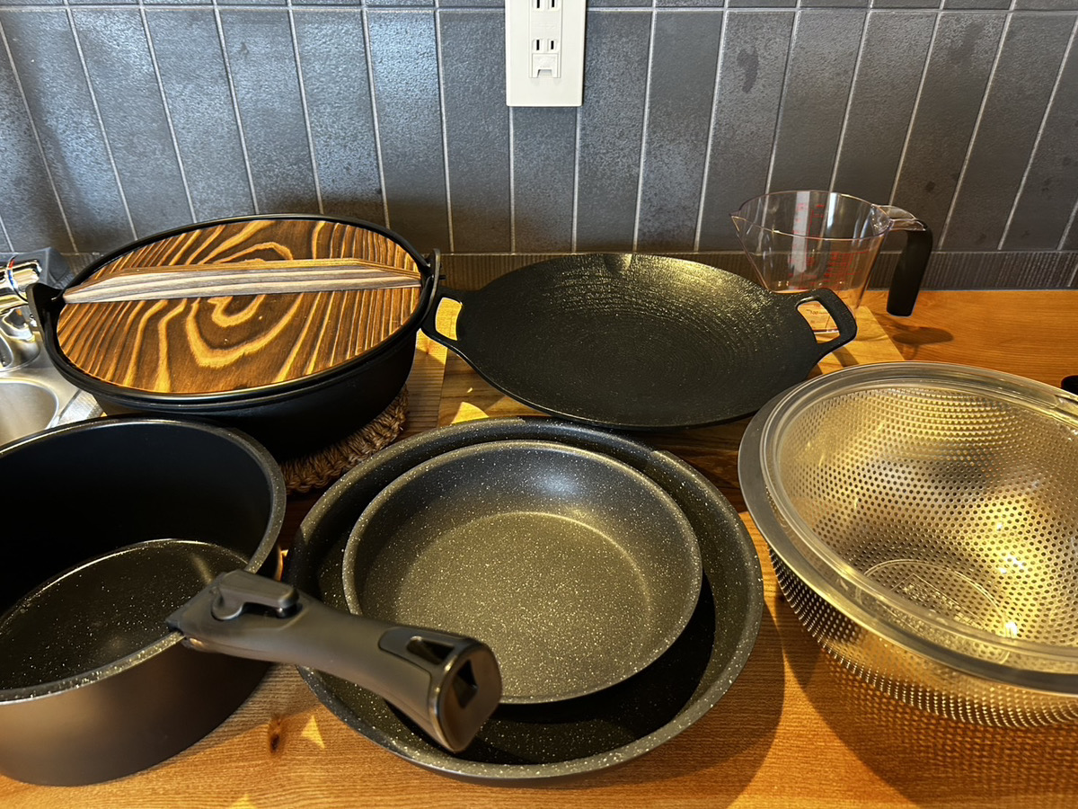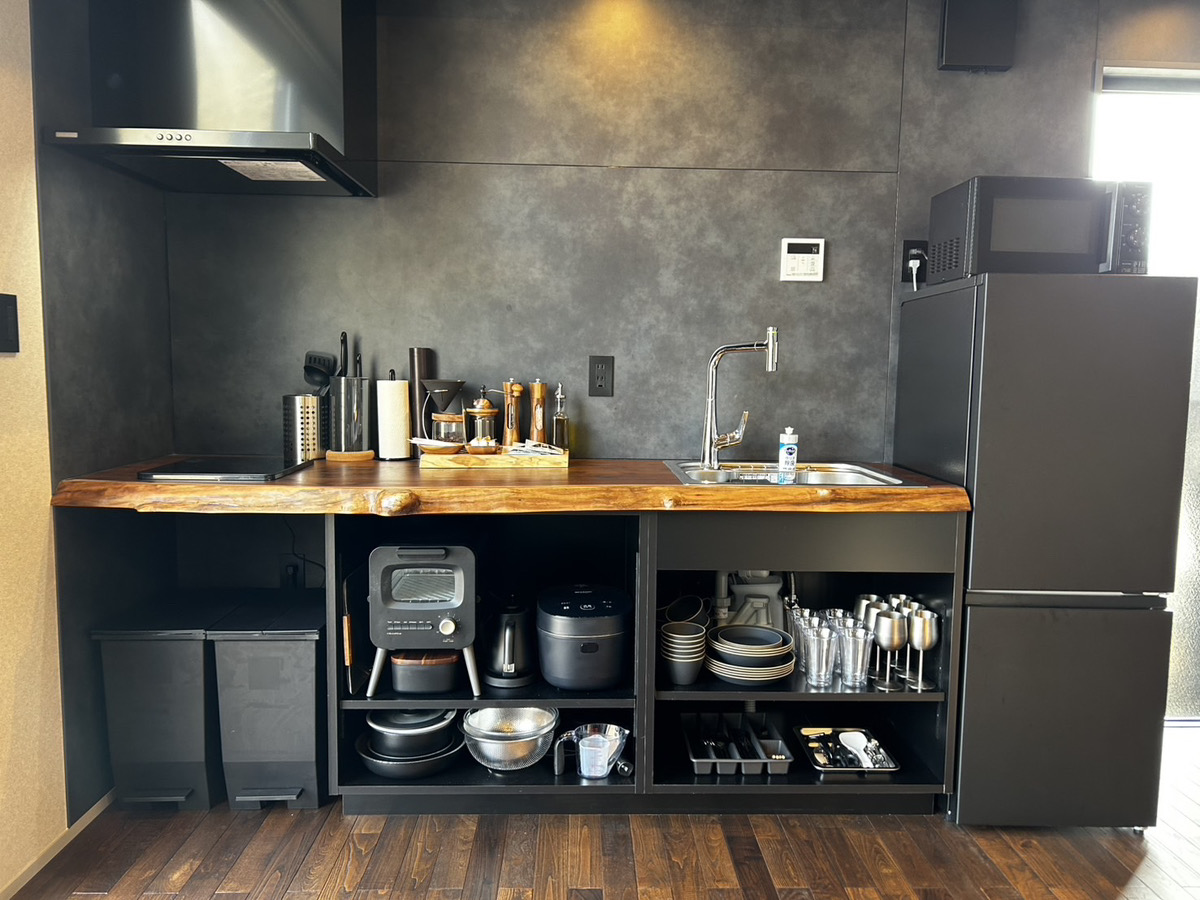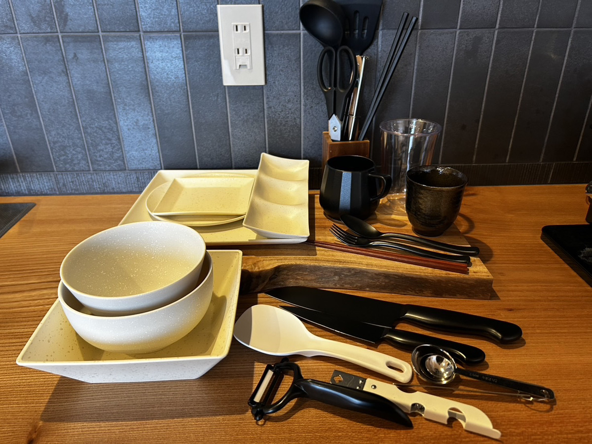 冷暖房/TV/Wifi/スピーカー/ドライヤー/冷蔵庫/電子レンジ/電気ケトル/炊飯器/トースター/囲炉裏テーブル(炭の用意あり)/お皿/お椀/スプーン/フォーク/ナイフ/箸/カップ/コップ/フライパン大小1ずつ/鍋/ボウル/ザル/軽量カップ/まな板/しゃもじ/軽量スプーン/栓抜き/ハサミ/ピーラー/お玉/フライ返し/菜箸/鉄鍋(囲炉裏、IH使用可)/鉄板プレート(囲炉裏、IH使用可)