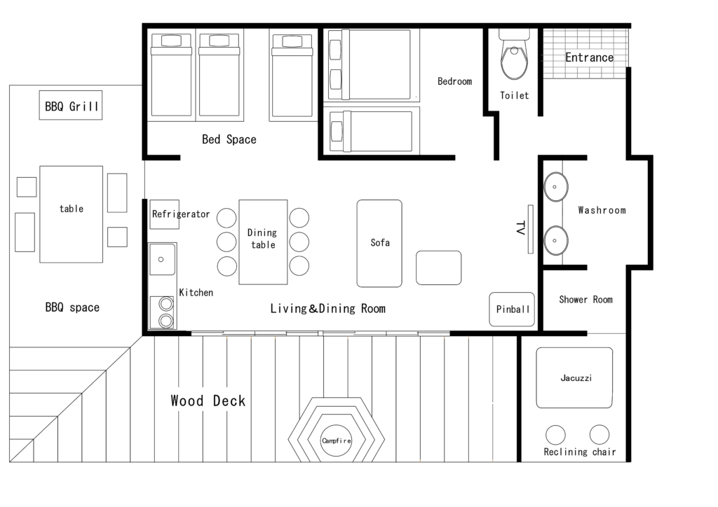 冷暖房/TV/Wifi/ドライヤー/冷蔵庫/電子レンジ/電気ケトル/炊飯器/トースター/フライパン鍋などの調理用具/カトラリー一式/バーベキューキット(炭の用意あり)/ピンボールマシン